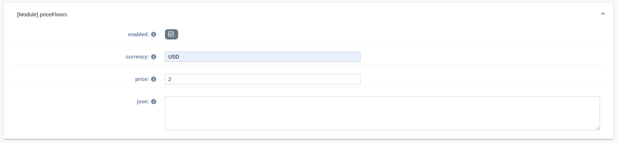 Please note that basic fields such as currency and price are available for standard configuration. For more advanced settings, you can use instead the json field, where the configuration should be provided in accordance with the documentation available here: https://docs.prebid.org/dev-docs/modules/floors.html.