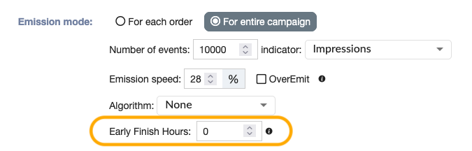 - Early Finish Hours attempts to complete an order or campaign earlier by the specified number of hours. All planned impressions are still distributed over the original delivery period, but are shortened by the value of Early Finish Hours.